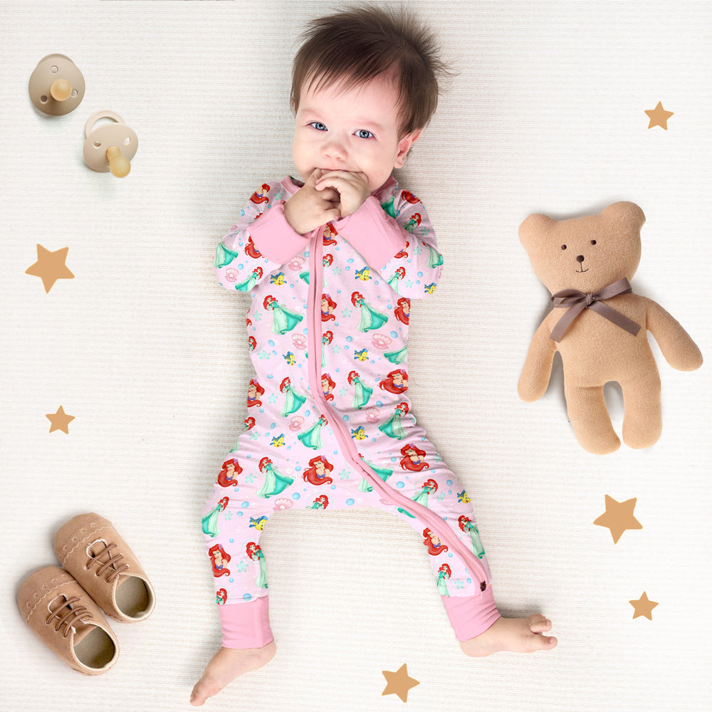 As a mom, you see the magic in every smile, every giggle, and every cuddle. The Little Mermaid Convertible Zippered Romper is designed to make those moments even more enchanting. Featuring beautiful designs of Ariel, her flowing hair, and her underwater friends, this romper lets your baby’s imagination swim into a world of fairy-tale wonder.