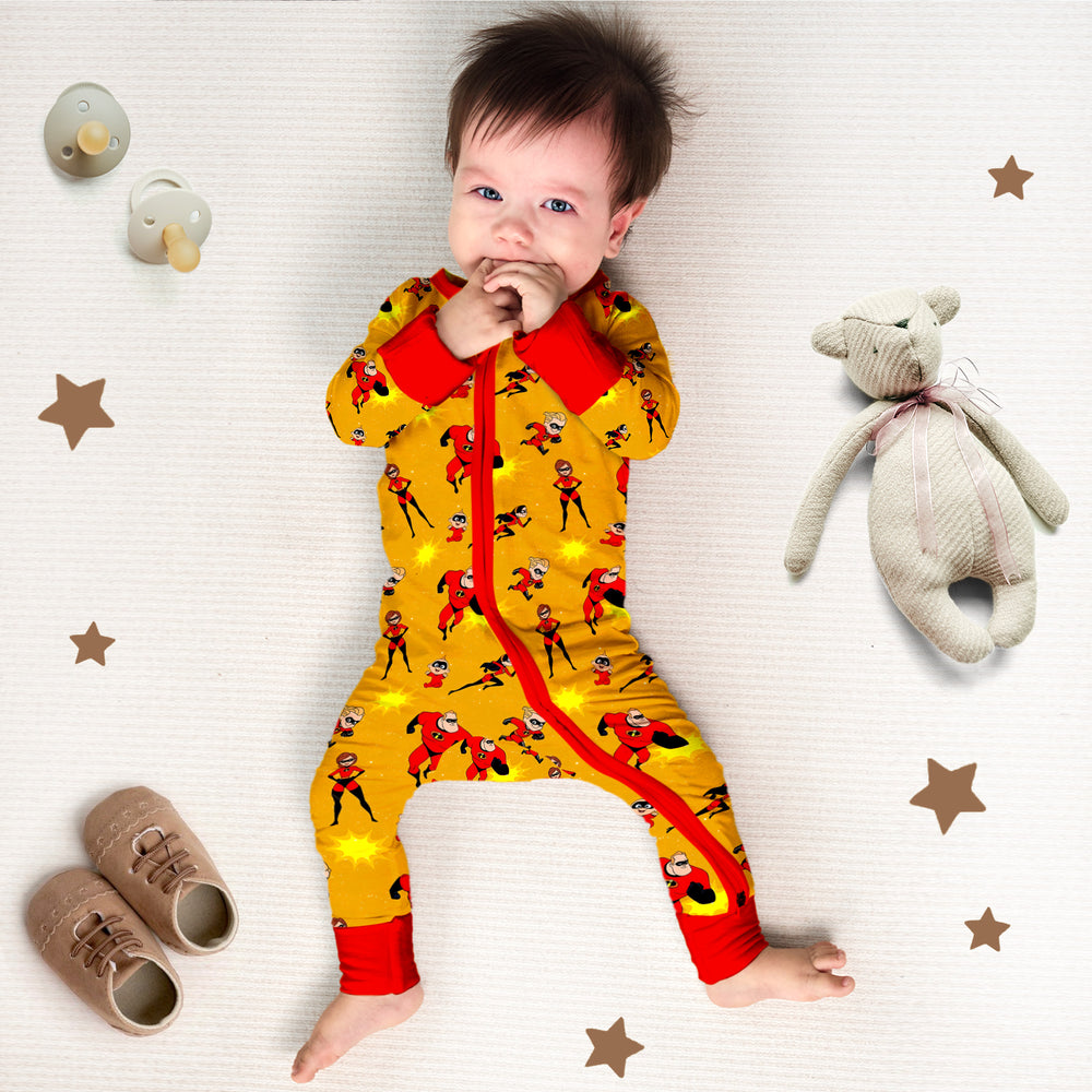 Inspired by the iconic characters from "The Incredibles" each romper in this collection features bold prints and vibrant colors, bringing the excitement of crime-fighting adventures to your little one's wardrobe. Crafted with soft, high-quality bamboo fabrics, these rompers provide both comfort and style for your tiny hero. Whether they are mastering their first crawl or unleashing their super giggles, our "The Incredible Collection" ensures that every moment is filled with unstoppable fun and charm. Get ready to dress your baby in superhero style and watch them conquer the day with incredible cuteness!